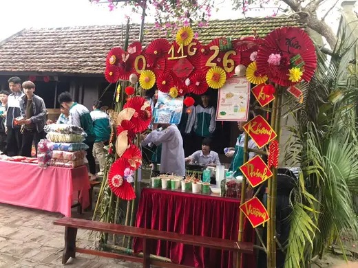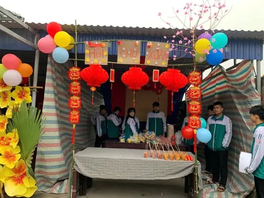 Ngay từ sáng sớm các gian hàng đã được trang trí bắt mắt với muôn vàn sắt đỏ, vàng của mai đào và những món ăn đậm hương vị giản dị của tuổi học trò. Từ ẩm thực những gian hàng đầy sáng tạo đến những trò chơi vui nhộn: Đi xe đạp chậm, ném vòng cổ vịt, ném bóng tất cả đã tạo nên một không gian xuân ấm áp, gần gũi và tràn đầy tiếng cười;